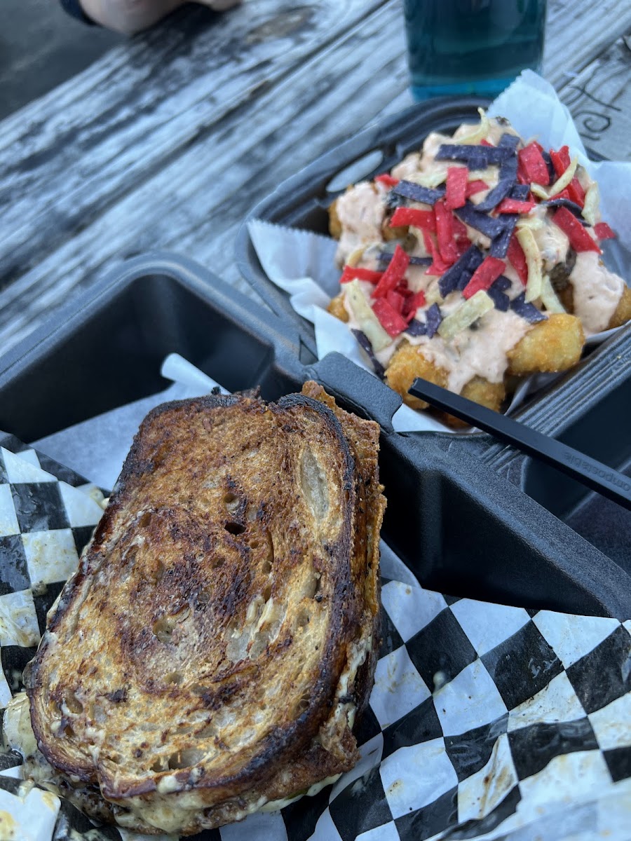 Tater Tots Loaded with Steak and Cheese and Sauce and Fried Cheese Skirt
